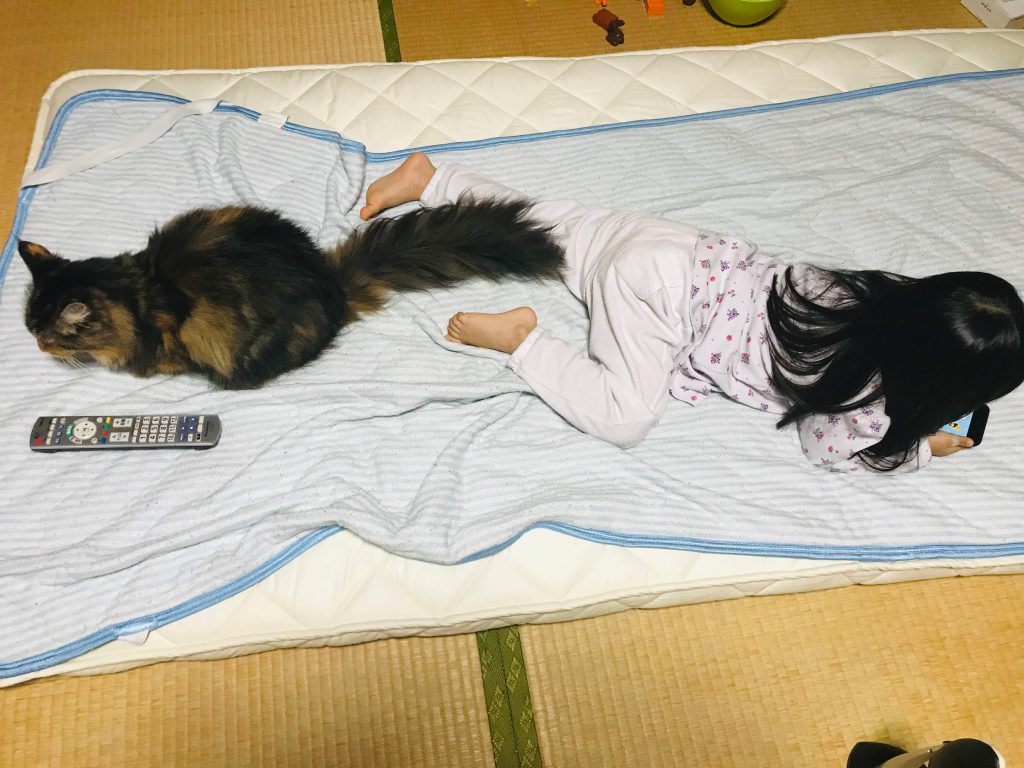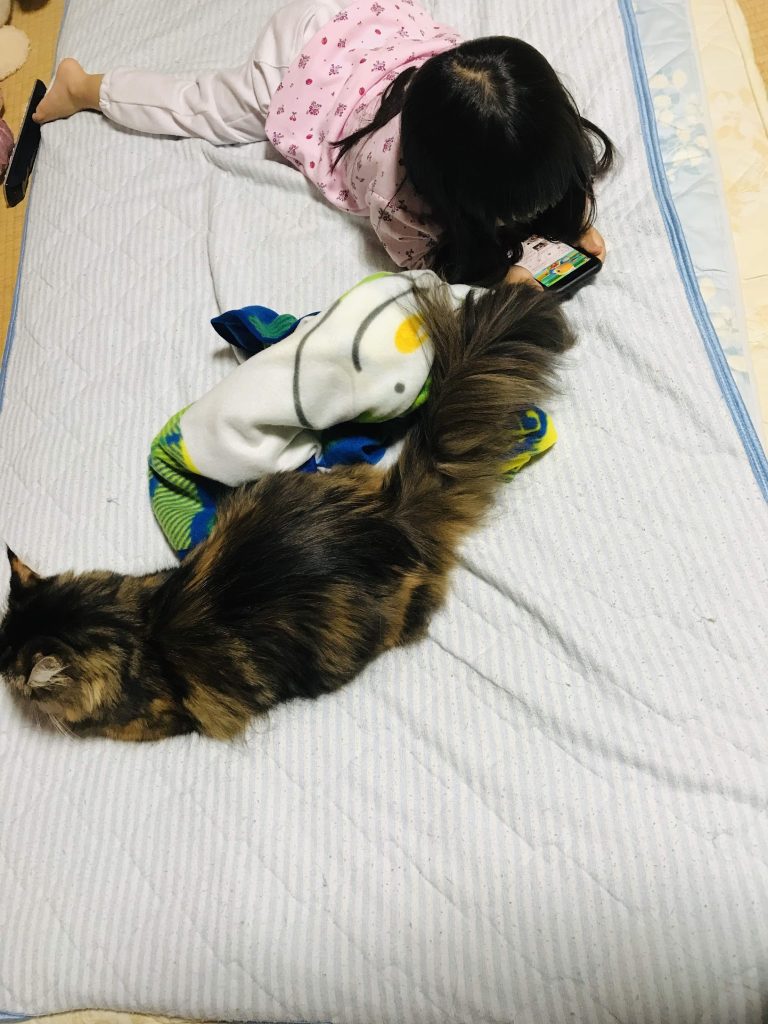 こういうお互い干渉しないけどそばにいる、という場面が多いです。娘にとっては生まれたときからずっといっしょにいる生き物で、みりんちゃんにとっては娘は「くすぐったい撫で方をする子」でした。