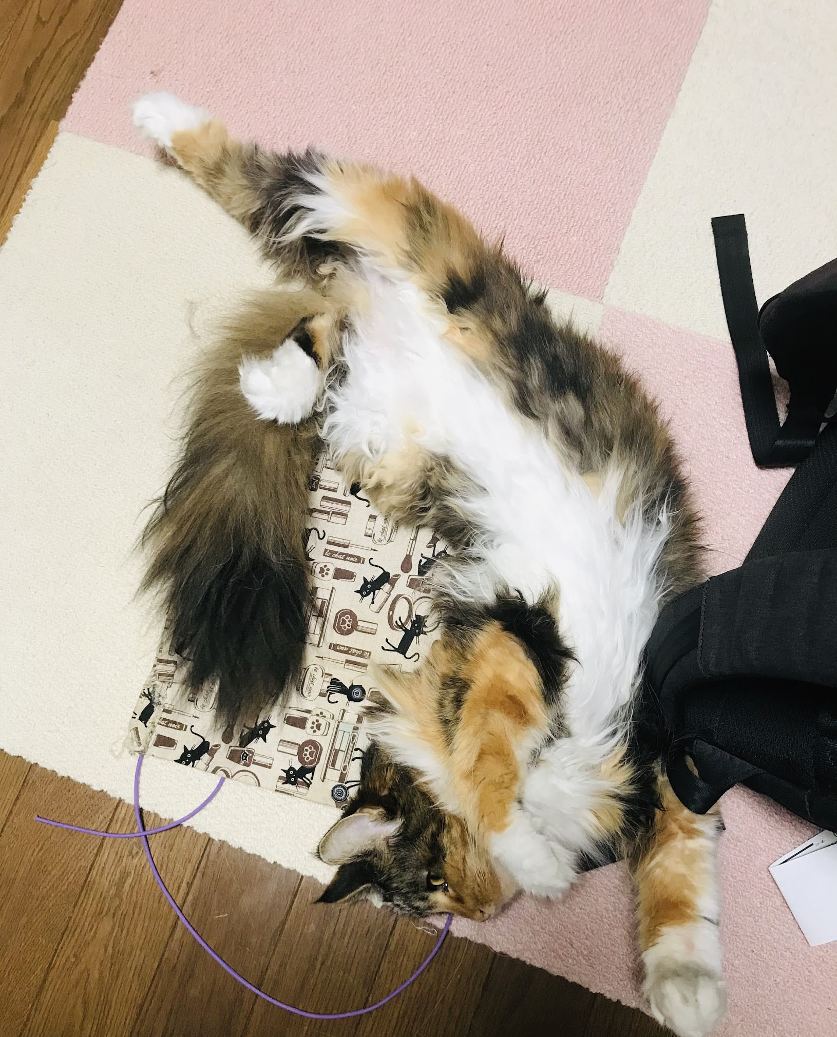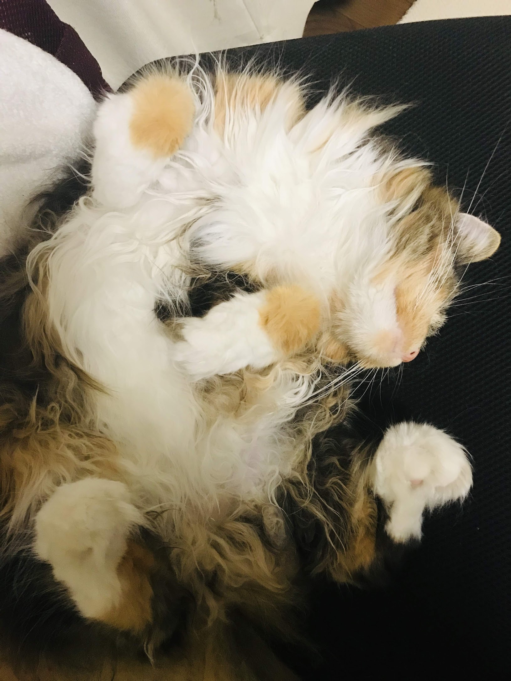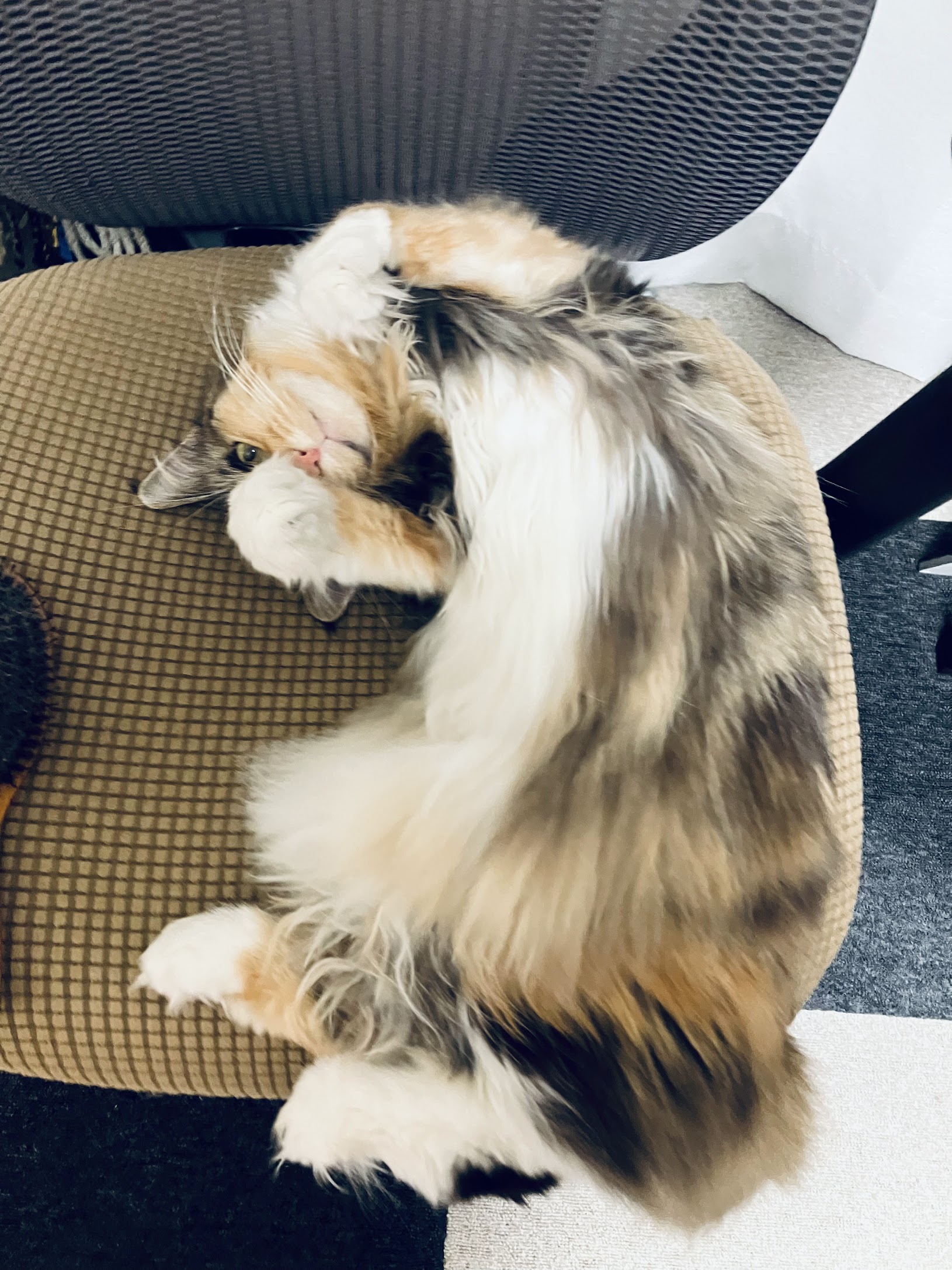 パパがテレワークになってから、仕事中はだいたいそばにいました。寒いときは椅子の上に固定した段ボール(電気毛布つき)で丸くなっていて、ときどき起きてご飯食べて毛づくろいを要求してました。